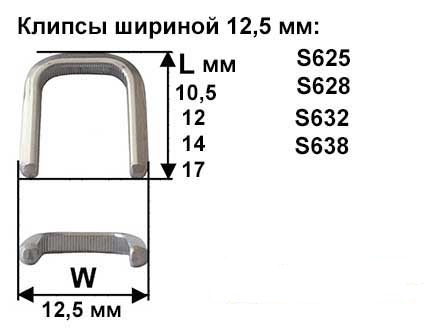 Скрепки - Клипсы шириной 12,5 мм, поставляются в полосках. Длина клипс 10,5 мм, 12 мм, 14 мм и 17 мм. Внутренняя ширина у всех клипс 7,7 мм. Сечение - трапеция с насечкой.