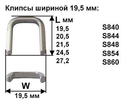 Клипсы (скрепки) шириной 19,5 мм, поставляются в полосках. Длина клипс 19,5 мм, 20,5 мм, 21,5 мм, 24,5 мм и 27,2 мм. Внутренняя ширина у клипс 12 мм. Профиль - трапеция с насечкой.