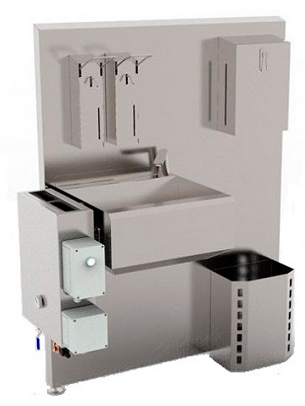 Гигиеническая стенка изготавливается из пищевой нержавеющей стали AISI 304 и с учетом пожеланий заказчика по её размерам и комплектации. В основе стенки цельносварная бесконтактная раковина, над которой установлен бесконтактный сенсорный смеситель, включающийся автоматически при поднесении рук.